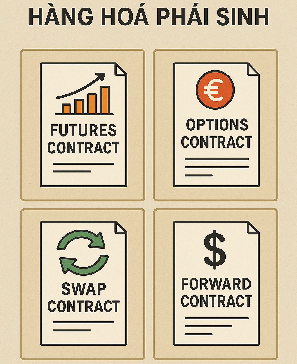 - Hợp đồng tương lai (Futures contract): Hợp đồng tiêu chuẩn về mua bán hàng hóa tại một thời điểm trong tương lai
