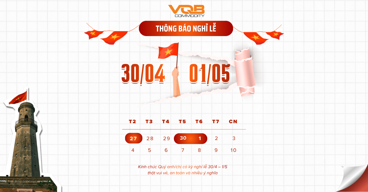 Công ty Cổ phần Tập đoàn Khoáng sản và Thương mại VQB (VQB Commodity – Thành viên Kinh doanh số 041 của Sở Giao dịch Hàng hóa Việt Nam – MXV) trân trọng thông báo lịch nghỉ lễ trong tháng 4 và tháng 5/2026 như sau: